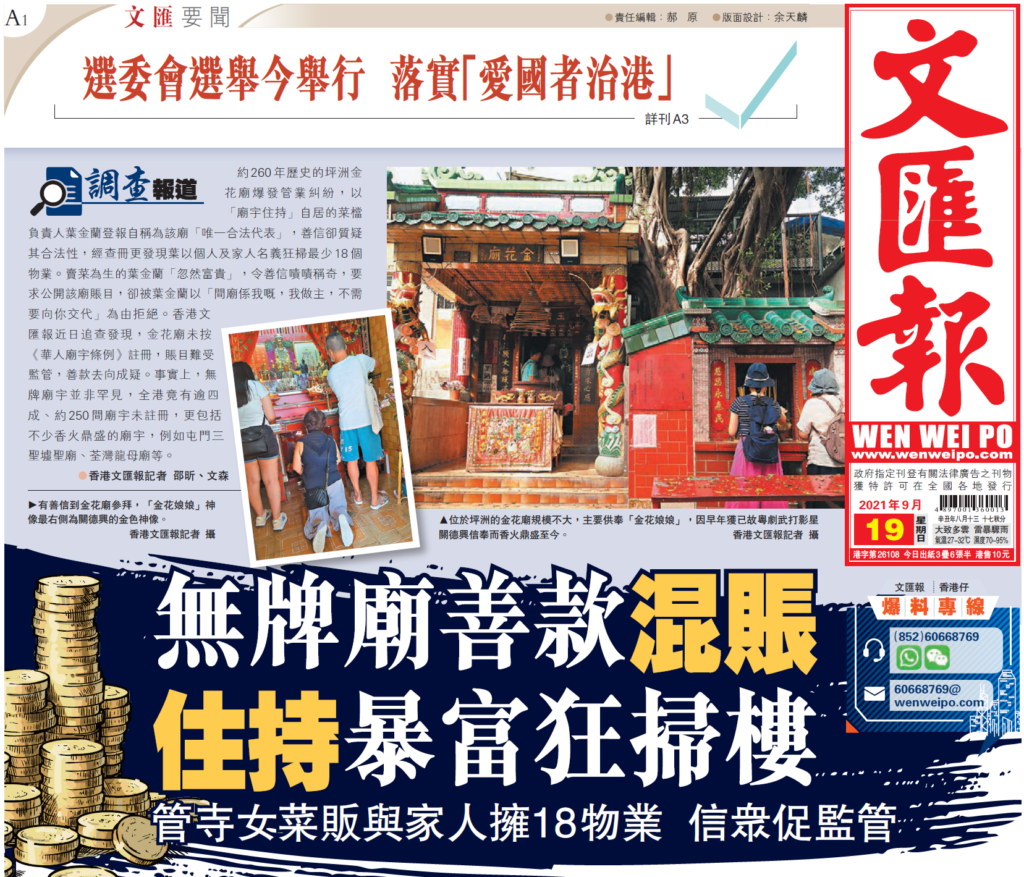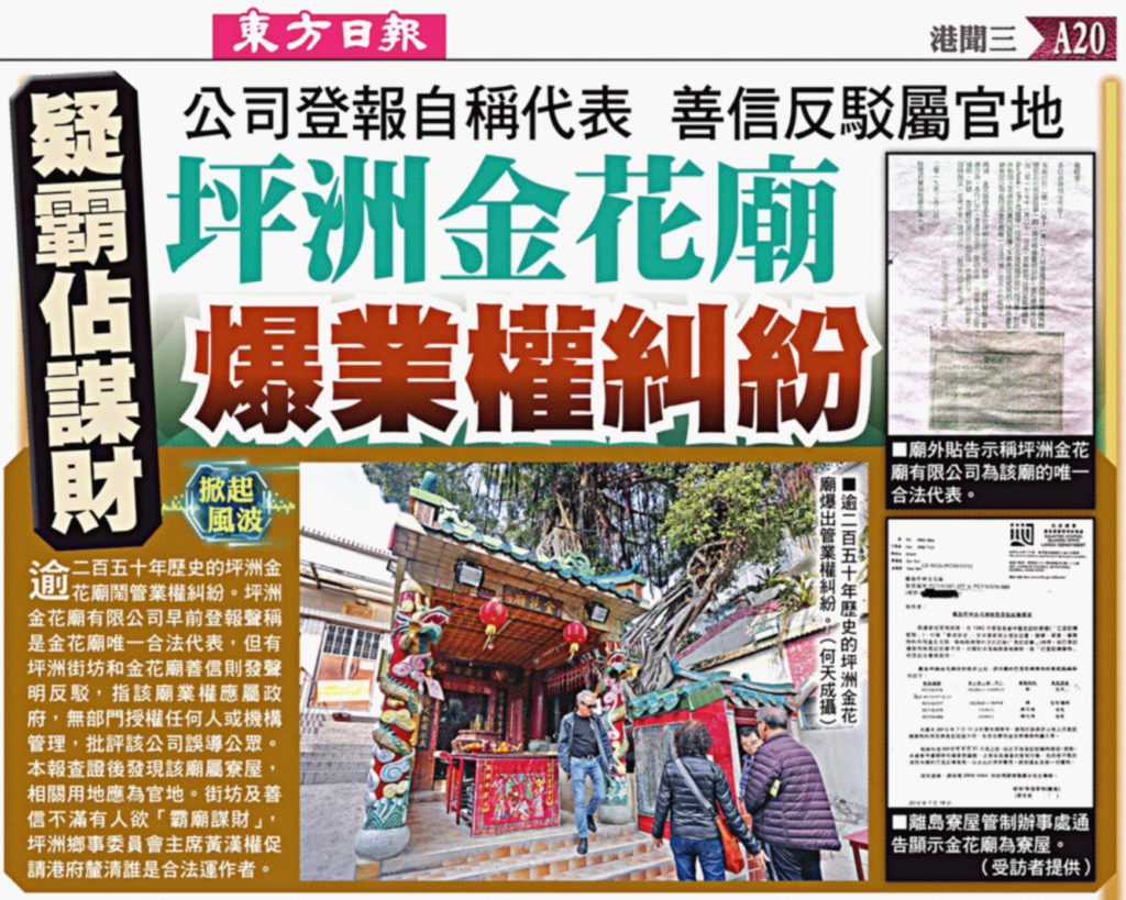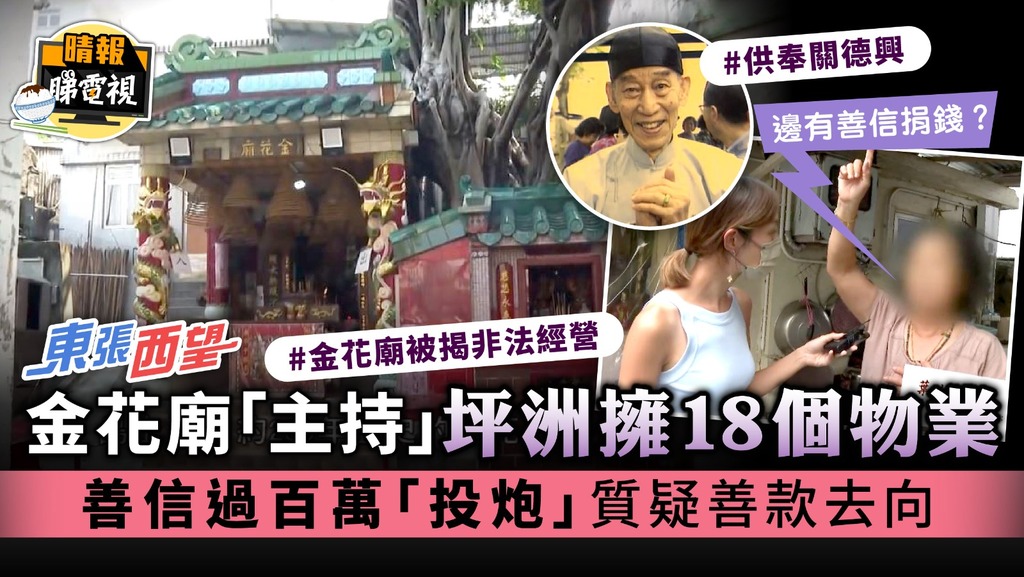 約260 年歷史的坪洲金花廟爆發管業糾紛, 以「廟宇住持」自居的菜檔負責人葉金蘭登報自稱為該廟「唯一合法代表」,善信卻質疑其合法性,經查冊更發現葉以個人及家人名義狂掃最少18 個物業。賣菜為生的葉金蘭「忽然富貴」,令善信嘖嘖稱奇,要求公開該廟賬目,卻被葉金蘭以「間廟係我嘅,我做主,不需要向你交代」為由拒絕。